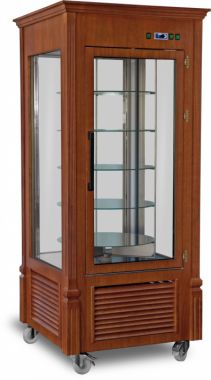 Szafa cukiernicza JOLA 4 RETRO jest urządzeniem przeznaczonym do ekspozycji wszelkich artykułów cukierniczych takich jak torty, ciasta, czekolady, desery. Korpus zewnętrzny szafy JOLA 4 RETRO wykonany jest w klasycznym, ozdobnym wykończeniu drewnianym. Jej wygląd i możliwość konfiguracji kolorystycznej sprawia, że urządzenie dopasuje się do najczęściej spotykanych wystrojów wnętrz cukierni, kawiarni czy różnego typu sklepów. Urządzenie posiada system półek szklanych z możliwością zastosowania ich w wersji obrotowej, co pozwala pięknie wyeksponować produkty. W szafie zamontowano drzwi rozwierne z szybą zespoloną i agregat chłodniczy wewnętrzny znajdujący się w dolnej części urządzenia. Wnętrze urządzenia oświetlone przy pomocy energooszczędnej świetlówki LED.