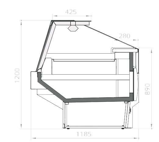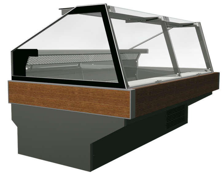 Nowoczesna lada chłodnicza, wyposażona w podnoszone szyby ustawione pod kątem. Lada posiada nowoczesny design i może być wyprodukowana w dowolnym stylu. Lada może być stosowana do ekspozycji surowego mięsa, pieczywa, ciast, jak również dostępna jest w wersji bemar grzewczy. Lada może być wyposażona w agregat wewnętrzny jak i może mieć możliwość podłączenia do agregatu zewnętrznego.